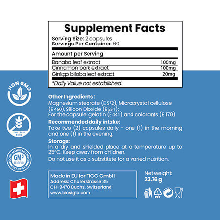 Banaba leaf and cinnamon have been reported increase the release of insulin, reduce the absorption of intestinal glucose, enhance the synthesis of glycogen.